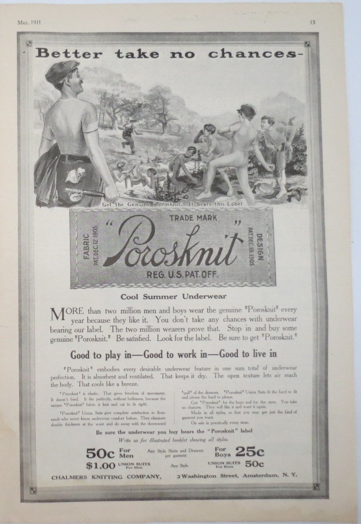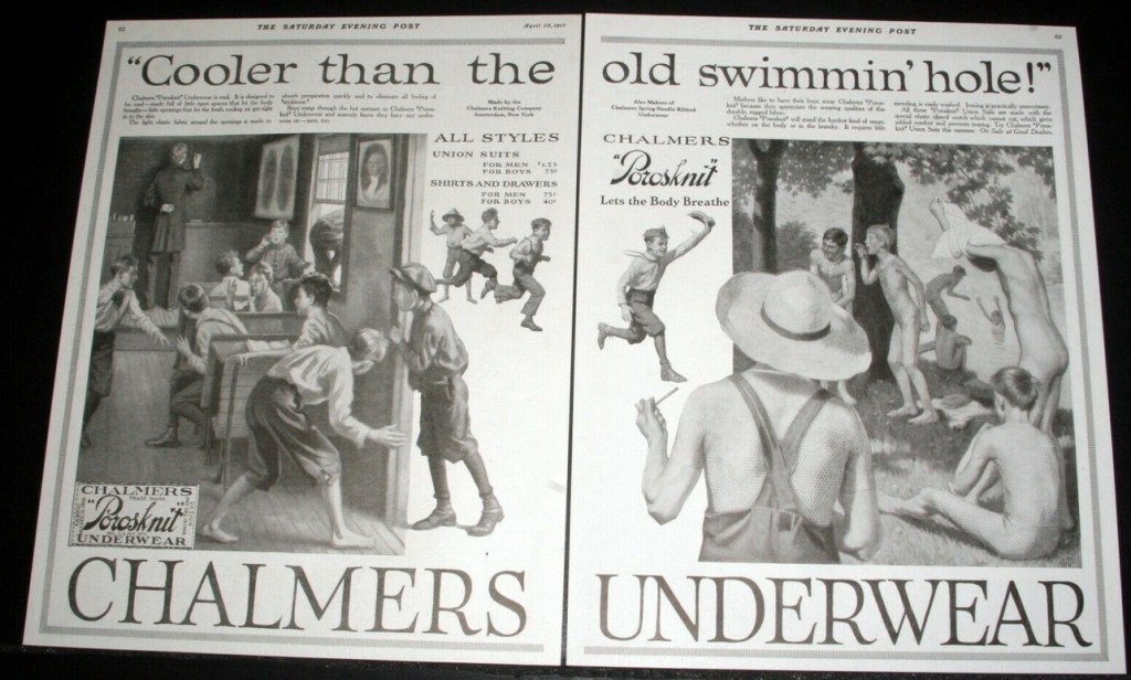 This two-page ad from 1917 is a chin scratcher. Are they trying to say that boys can strip out of their underwear more readily than with other brands? Pushing the point, they seem to be channeling Tom Sawyer with the straw-hatted lad clutching a corncob pipe. Note that in all these ads except for the figures actually in the water, none of the boys is nude. They’re all in close-fitting, button closure union suits. Yes, sir, that’s real comfort.