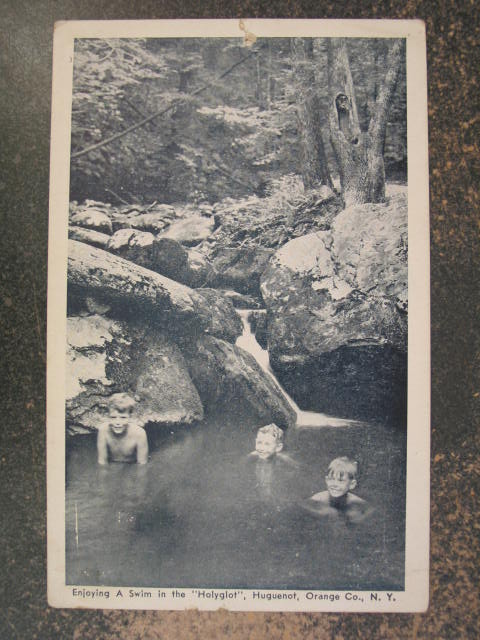Picture postcards typically captured images of natural and man-made points of interest or activities peculiar to a particular place. Vacationers and visitors were the target audience for these types of wares. Curiously, if a locale had a well-known swimming hole, it might be the subject of a postcard picture. The following are examples of that.