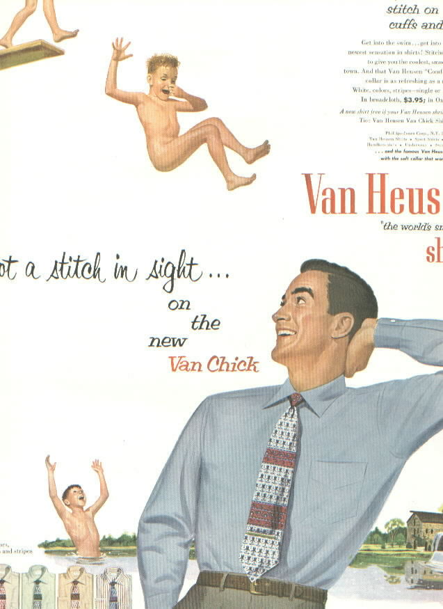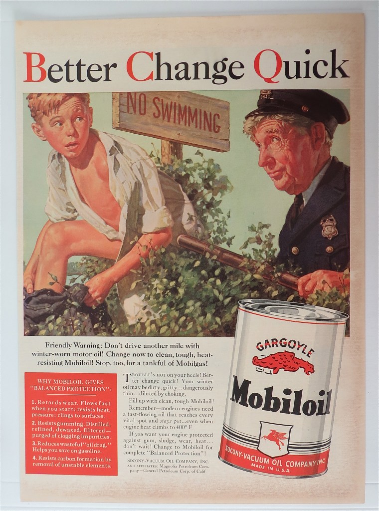 The ads that depict skinny dipping may have been designed to trigger nostalgic memories in the viewers (especially male viewers). The more facile ads used word play to reference skinny dipping as a metaphor for whatever they were hawking. This motor oil ad is a case in point.