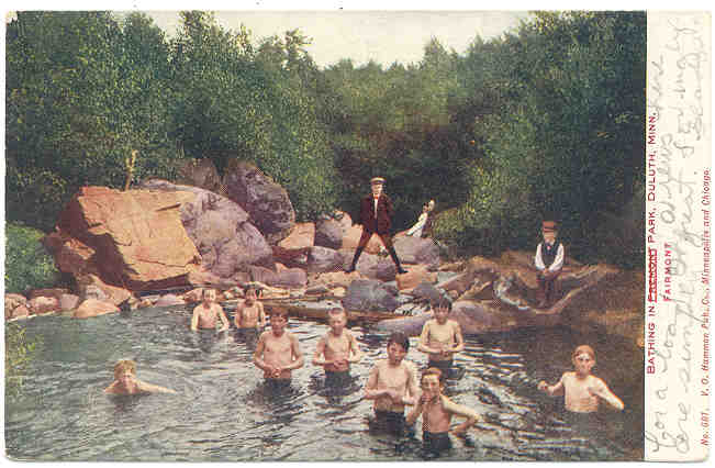 The printing along the border of this image that would have identified the location is long faded, but this is a familiar scene. We last saw it as a black and white photo in the Noteworthy Skinny-Dipping Scenes page. The scene is in Lester Park near Duluth, Minnesota in 1904.