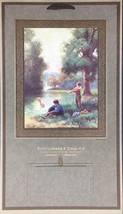 Another type of print advertising was the give-away. Instead of paying for newspaper and magazine ads that may or may not reach your targeted audience, hand out items of nominal value and some utility in your local community. Down through the years, these have included pencils and pens, paper weights, shopping bags and refrigerator magnets – all emblazoned with the advertiser’s name and message. Probably the king of the give-aways was the wall calendar. Pinned up in a prominent place, so it can be consulted readily, your offering is always on view waiting for the moment that it is needed. Of course, it needs to have an attractive graphic so the consumer will want to hang it. In 1924, the City Lumber & Coal Company chose a skinny-dipping scene (Labeled “The Old Swimming Hole”) for its calendar art.