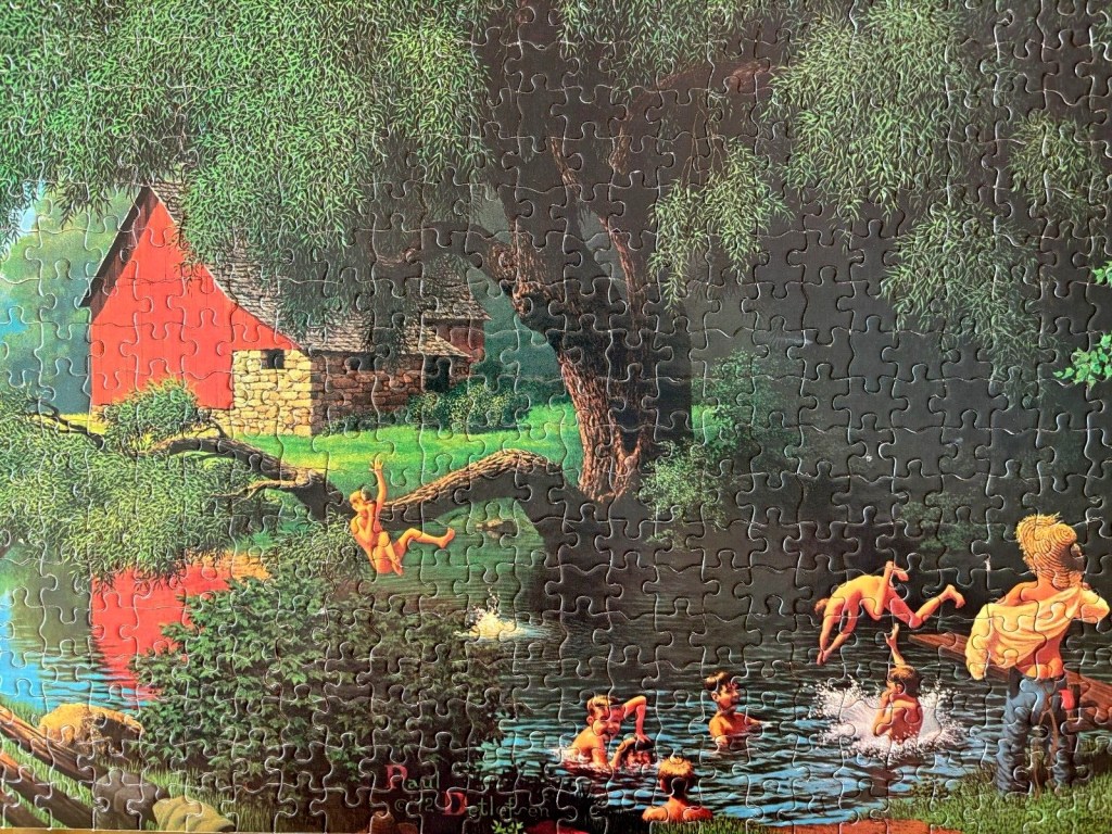 This jigsaw puzzle was published by Milton Bradley, the famous game company, in the 1980s. It includes all of the iconography of classic rural skinny dipping.