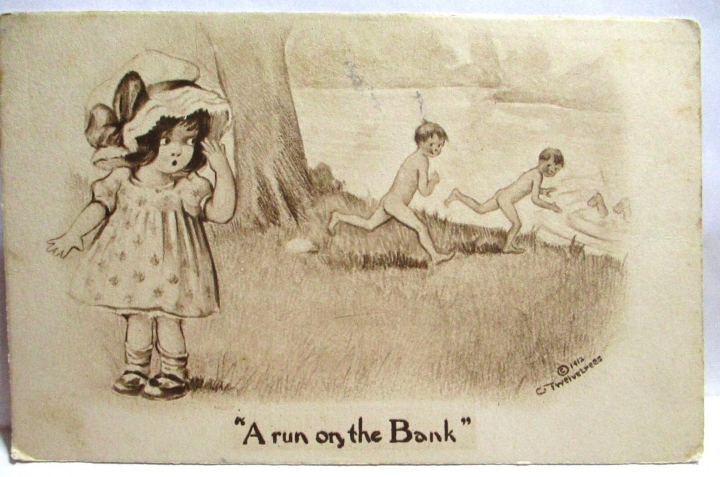 Produced in 1912, the title on this postcard is a play on words of a phrase that was used to indicate a public reaction to a rumored imminent financial failure. There may have been a more pointed meaning at the time this picture was published. Had there been a rash of bank runs in that time and place?