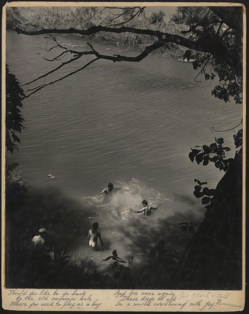 Not sure what this piece qualifies as. The print is mounted on cardboard and accompanied by some hand-lettered text (rhyme about the joy of the ol’ swimmin’ hole). It is signed by the photographer. It seems likely that it was intended for commercial distribution.
