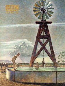 The cover of the November, 1953 issue featured a 1945 painting titled “Oasis.” The work was by noted New Mexico artist Peter Hurd. The topic of the cover graphic showed a uniquely southwest take on skinny-dipping. Two naked boys are taking a swim in a water storage tank being continuously filled by a windmill-driven pump in the midst of the dry scenery of a ranch. The water system itself was similar to installations that could be found on nearly any farm anywhere in the US at the time. But in the arid climate of the region, with little access to streams and lakes, the boys had found another use for the tank.