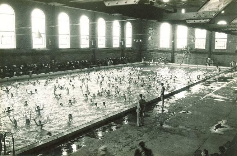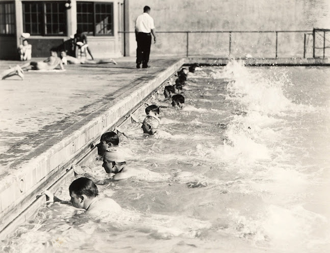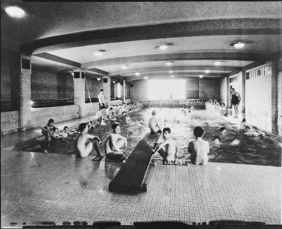 This is another narrow pool in a dungeon-like environment that looks seedy and even unhygienic. However, once you get past that observation, there is a lot to contemplate here. In this later date, swim instruction has become very interactive with multiple suited instructors milling about among the students. The guy with the megaphone appears to be in overall charge. But the real point of interest is the fact that most of the boys are equipped with flotation devices – water wings. Also, some of the kids appear to be wearing suits while others are nude. The slow shutter speed necessitated by the low light causes figures in the foreground to smear in motion.