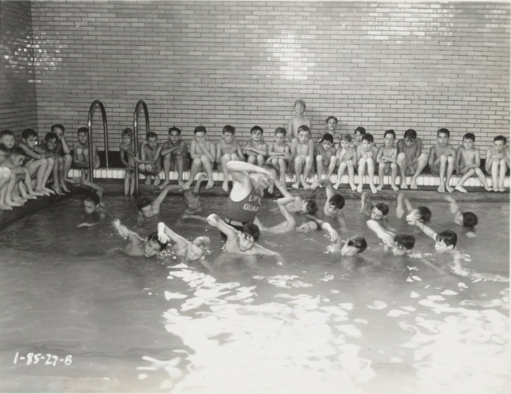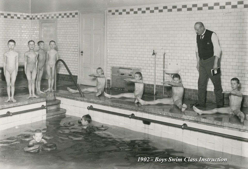 The most noteworthy aspect is that in scrutinizing the boys around the periphery of the pool, it appears that some are in trunk suits and some are nude. The 1926 APHA recommendation for all nude swimming was still some years away.