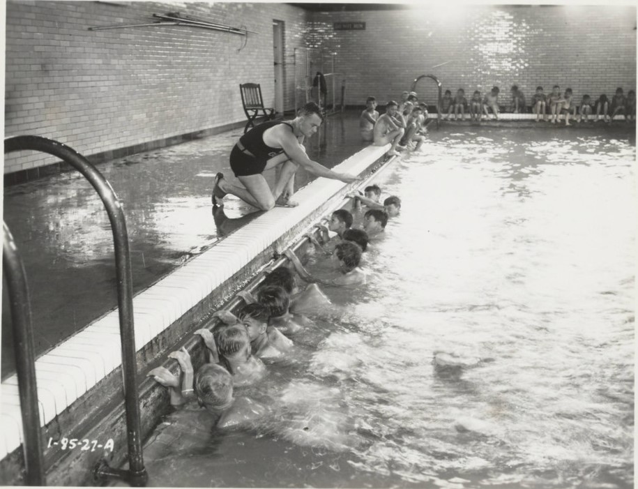 Fast forward another decade. This strapping young man in the immaculate swimming costume is conducting classes in the mid-1930’s. He is apparently an employee of the Chicago Park District posing for publicity photos with his (numerous!) young charges. While some things have changed since 1902, the one thing that remains constant is the nudity of the swimming students. I can imagine that the one injunction that was repeated before each picture was snapped was “Keep those knees together!”