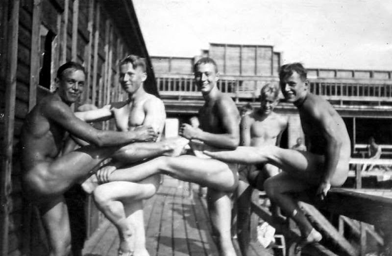 This eye-popping image is from the archives of the Durham County Library in a set from a private photographer that spans the years 1933-47. This large group of teenage boys are indisputably nude. The attributes in the archive does not indicate the composition of the group (swim team, swim class, etc.) or the purpose for which the picture was taken (e.g., yearbook). The photographer obviously had the cooperation of the subjects who seem to be posing with complete aplomb.