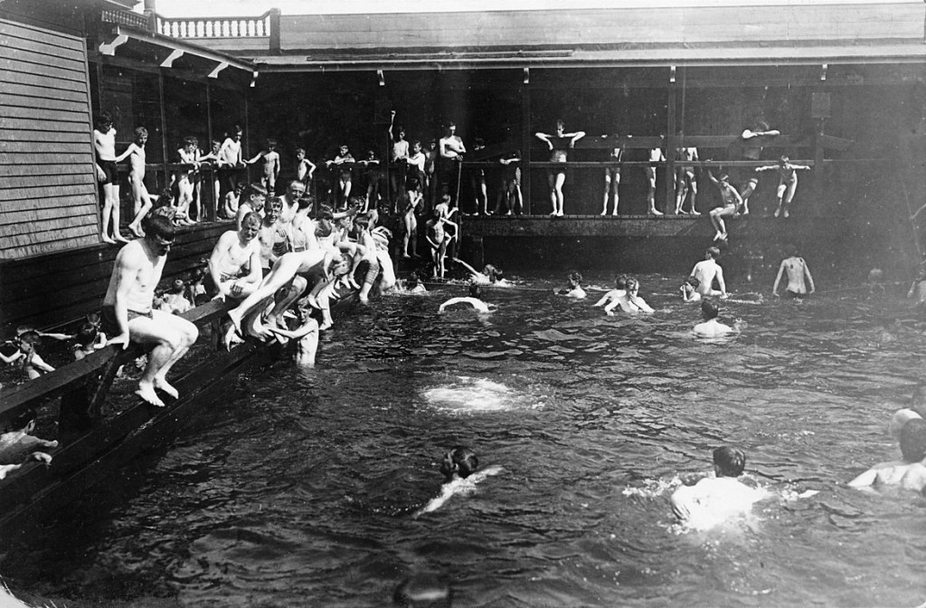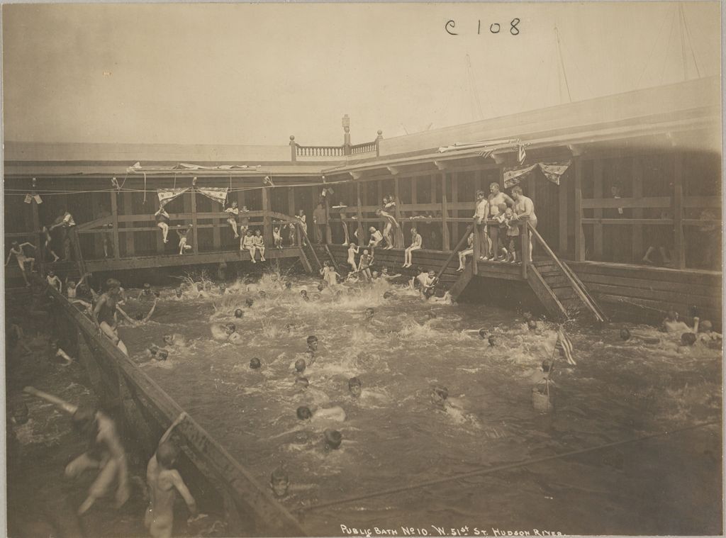 The description accompanying this floating bathhouse image retrieved from the New York State Archives was “NYC Swimming School 1900.” It seems as though neither swim suits nor order were required for instruction.