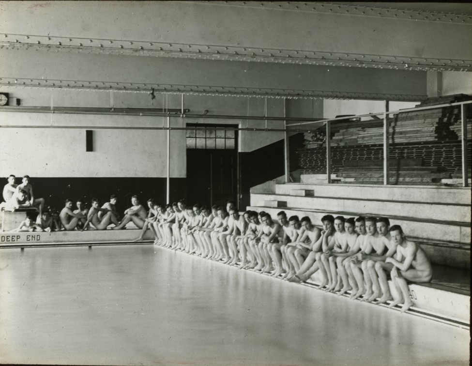 This image is attributed to Stanford University in 1930. This is the Encina Gym pool. These are probably the guys that failed their swimming qualification test, so they’re in a learn-to-swim class. Note the naked males lounging on the deck.
