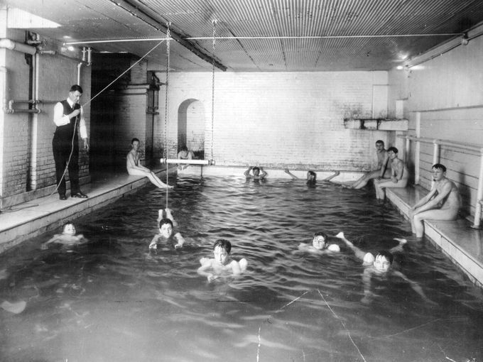 This is a scene in the E 23rd Street indoor municipal pool in New York City. The date is 1912-13. This facility is contemporaneous with the floating bathhouses operating in that same city. Apparently, residents had a choice of the types of swimming venues they could use.