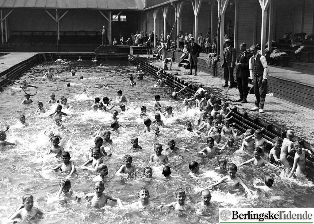This image is from the Museum of the City of New York, which was founded in 1923 and was apparently overshadowed by the more prominent institutions of this type in that city. There is no information offered relating to this photo, so we will have to conclude that the scene is from a city facility and the date is from sometime before 1920. There seems to be quite an age range among the clientele. From what can be seen, the older patrons seem to be eschewing suits like the youngsters – the water seems to be breaking low enough on their hips strongly suggesting they are not wearing suits.