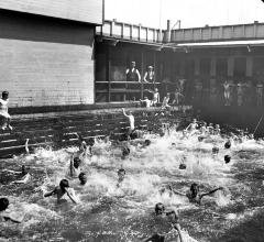As noted in my first post, the public floating bathhouses in New York City were retired in the 1920’s due to public health concerns. This next image seems to capture the transition to swimming pools.