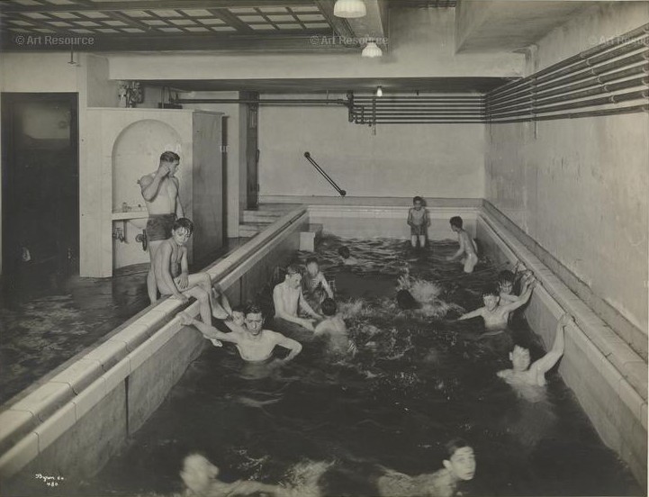 This photo was retrieved from the Museum of the City of New York. The accompanying text says that the boys shown are from the School for the Blind. No date is given. The narrowness of the pool seems to preclude normal swimming activities. Its shape is suggestive of a therapy bath. As in the previous photo, it looks like there is a mix of suited and non-suited participants.